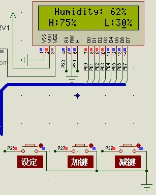 此时,湿度低报警灯和蜂鸣器处于关闭状态,继电器RL1开关打至下方,水泵处于断电状态。