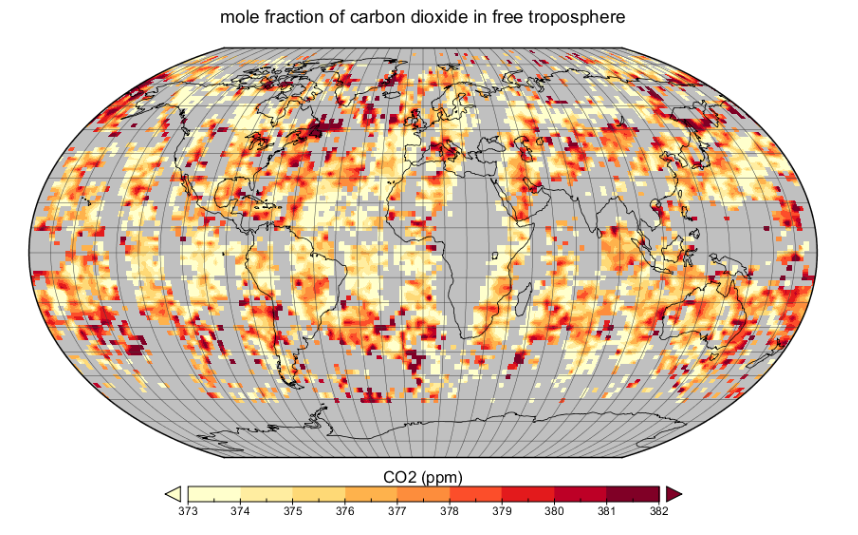 AIRS Science Team/Joao Teixeira (2009), AIRS/Aqua L3 Daily CO2 in the free troposphere (AIRS+AMSU) 2.5 degrees x 2 degrees V005, Greenbelt, MD, USA, Goddard Earth Sciences Data and Information Services Center (GES DISC), Accessed: [Data Access Date],