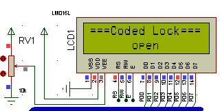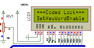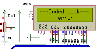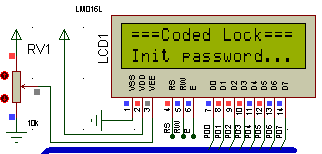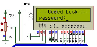 (1)51单片机加载Lock程序的Hex文件,进行仿真运行,此时LCD显示初始密码输入界面。