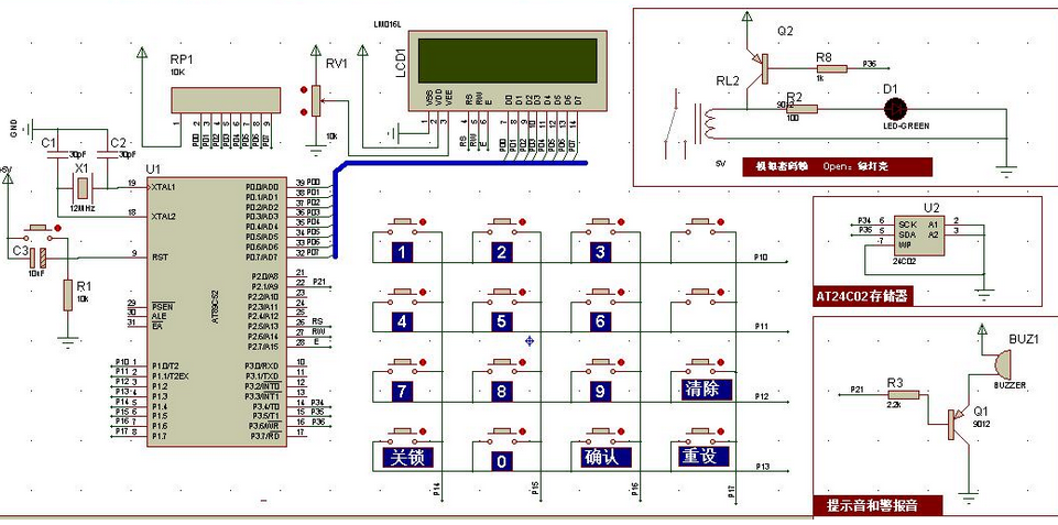 (5)4×4的矩阵键盘其中包括0-9的数字键和确认、重设、清除以及关锁功能键;