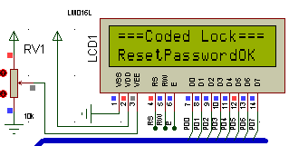 (4)此时,输入6位新密码,点击“重设”键,LCD显示“inputagain”,再次输入6位新密码,点击“重设”键,密码重设成功,此时LCD显示“ResetPassword OK”,新密码被写入AT24C02存储器。即使仿真结束,或单片机复位,AT24C02存储的密码都不会丢失。