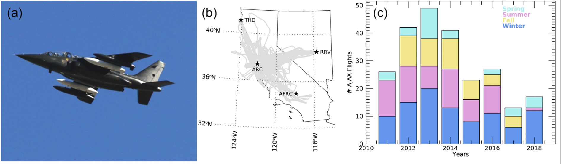 Alpha Jet Atmospheric eXperiment (AJAX) 是美国国家航空航天局艾姆斯研究中心与 H211, L.L.C. 公司的合作项目,旨在促进对加利福尼亚、内华达和太平洋沿岸地区进行例行现场测量,以支持卫星验证。标准有效载荷包括经过严格校准的臭氧(O3)、甲醛(HCHO)、二氧化碳(CO2)和甲烷(CH4)混合比,以及包括三维风在内的气象数据。每次 2 小时的飞行可完成多个垂直剖面(约 8.5 千米)。十多年来,AJAX 项目一直在定期收集各个季节的痕量气体数据,帮助评估卫星传感器在其大部分寿命期间的健康状况和校准情况,并对该地区其他地方收集的地面和塔基观测数据进行补充。AJAX 支持美国国家航空航天局的轨道碳观测站 (OCO-2/3)、日本的温室气体观测卫星 (GOSAT) 和 GOSAT-2,并与许多其他研究机构(如加利福尼亚空气资源委员会 (CARB)、国家海洋和大气管理局 (NOAA)、美国林务局 (USFS)、环境保护局 (EPA))开展合作。AJAX 在 2016 年庆祝了其第 200 次科学飞行,之前的研究调查了平流层到对流层的传输、森林火灾羽流、大气河流事件、从亚洲到美国西部的污染远距离传输、城市外流以及天然气泄漏、油田和奶制品厂的排放等各种主题。