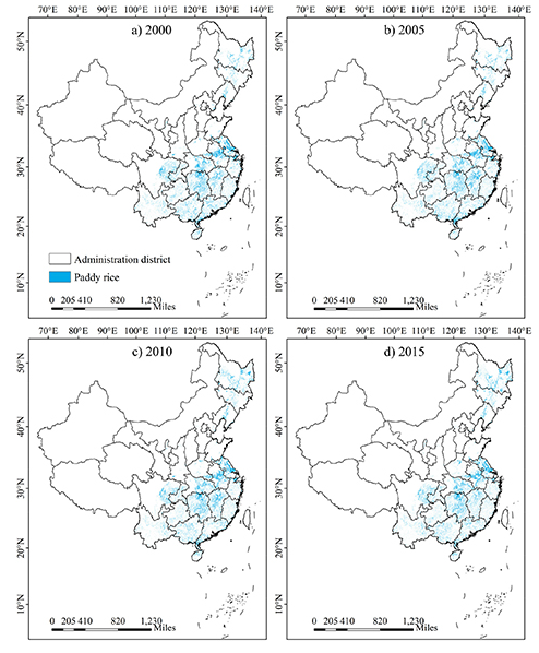 2000 年至 2015 年中国三种主要作物(即水稻、小麦和玉米)的 1 km 收获面积数据集