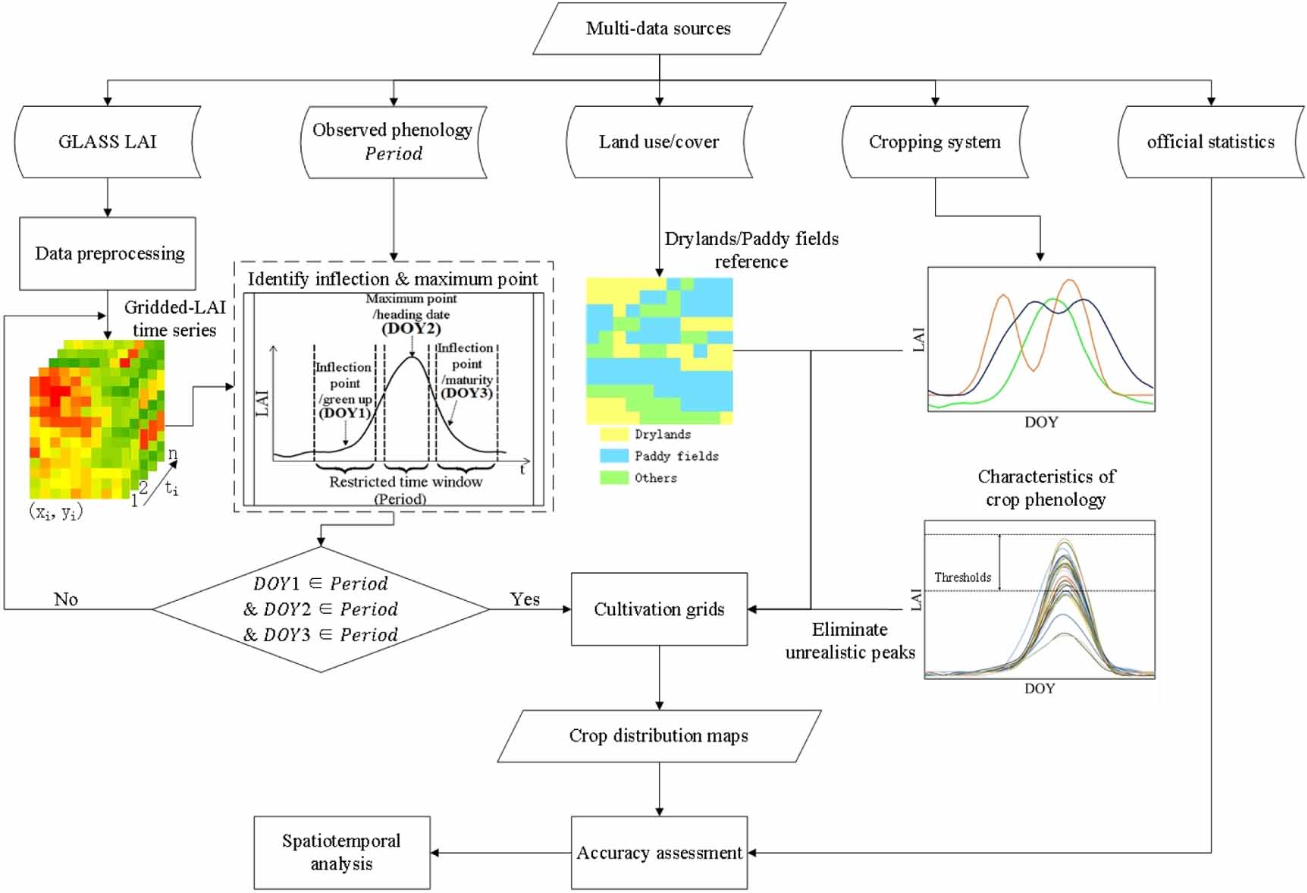 可靠、连续的主要作物收获面积信息对于研究地表动态和制定影响农业生产、土地利用和可持续发展的政策至关重要。然而,中国目前还没有高分辨率的空间明确和时间连续的作物收获面积信息。全国范围内主要农作物收获面积的时空格局也鲜有研究。在本研究中,我们提出了一种新的基于作物物候的作物制图方法,以 GLASS 叶面积指数(LAI)产品为基础,生成 2000 年至 2015 年中国三种主要作物(即水稻、小麦和玉米)的 1 km 收获面积数据集。首先,我们结合基于拐点和阈值的方法,检索了三种主要作物的关键物候期。然后,如果能同时确定某种作物的三个关键物候期,我们就能确定该作物的种植网格。最后,我们综合考虑了作物物候特征和旱地、水田的参照系,绘制了作物分类图和年收获面积数据集(ChinaCropArea1 km)。与县级农业统计数据相比,作物分类精度较高,R2 值始终大于 0.8。进一步分析了这一时期主要农作物收获区域的时空格局。结果表明,水稻收获面积在中国东北地区急剧扩大,而在中国南方地区则有所减少。全国主要玉米种植区的玉米收获面积大幅扩大。小麦收获面积虽然在主产区显著增加,但总体上有所减少。这些时空模式可归因于各种人为、生物物理和社会经济驱动因素,包括城市化、华南地区耕作强度降低、气候变化导致的灾害频发以及华北和西南地区的大面积撂荒农田。由此产生的数据集可用于多种用途,包括地表建模、农业生态系统建模、农业生产和土地利用决策。https://www.cbedai.net/xg