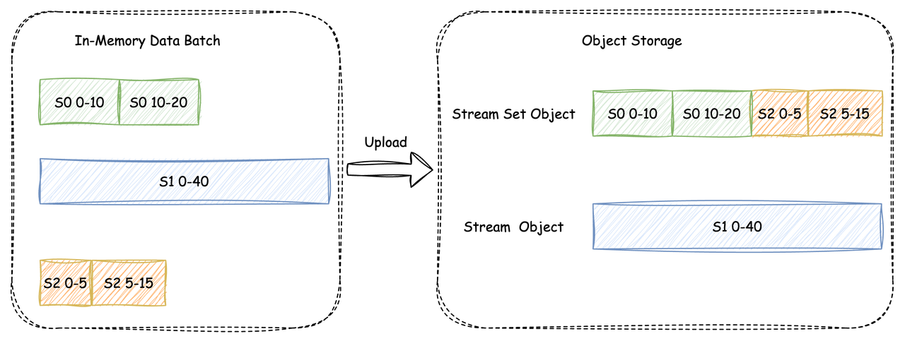 上传时,会将积攒的数据中同一 Stream 连续数据段长度超过一定阈值的数据直接上传为一个 SO,剩余的多个分区的数据按照 Stream Id 从小到大的顺序写入同一个 SSO 中,如下图: