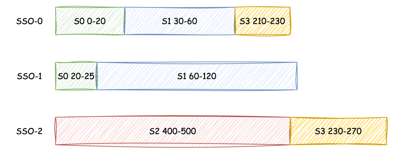 在 SSO Compaction 开始时,会先获取当前节点产生的所有 SSO,并读取各 SSO 的索引文件,解析出各个对象中的 Stream 和对应的数据范围,在这个过程中,各 Stream 过期的数据段将直接被忽略。本文将以下图所示的三个 SSO 的 Compaction 过程为例(需要注意的是,图上的色块长度仅用于表示对应数据段的长度,在这一步中,并未实际读取对应的数据段):