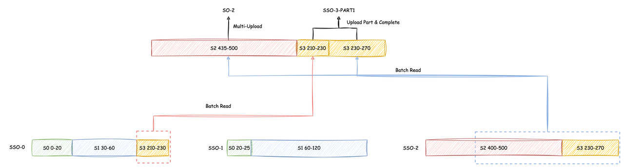 - S2 (435-500) 读取完成后通过 Multi-Part Upload 完成 SO-2 的上传3. S3 (210-230) 和 S3 (230-270) 读取完成后作为 SSO-3 的最后一个 Part 上传