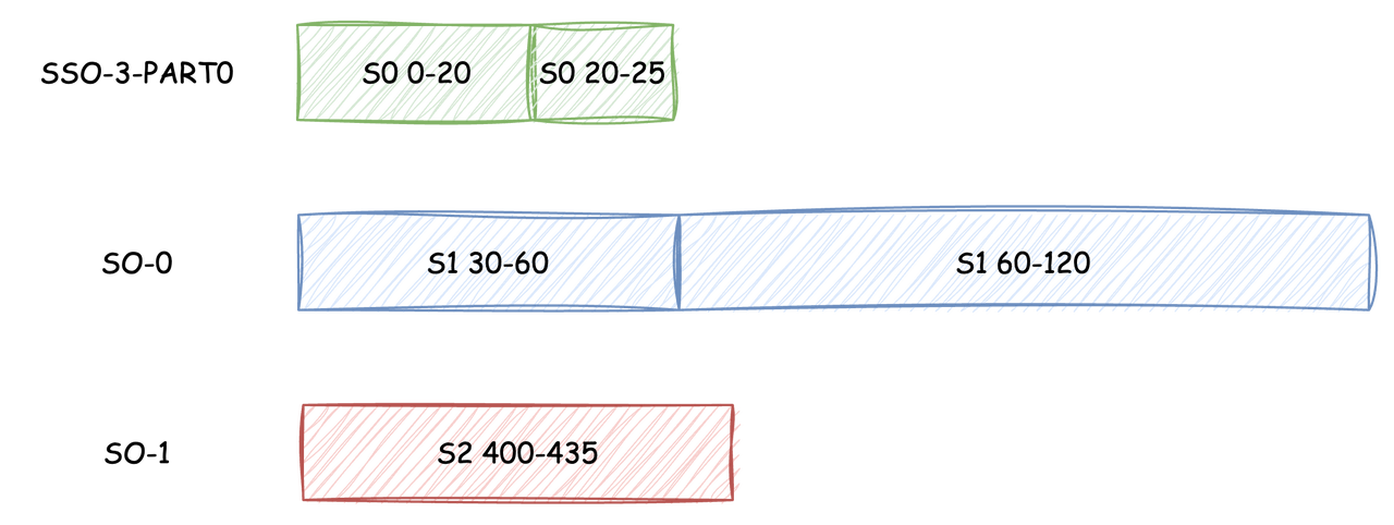 - S0 (0-20) 和 S0 (20-25) 读取完成后作为 SSO-3 的第一个 Part 上传3. S1 (30-60) 和 S1 (60-120) 读取完成后通过 Multi-Part Upload 完成 SO-0 的上传4. S2 (400-435) 读取完成后通过 PutObject 完成 SO-1 的上传