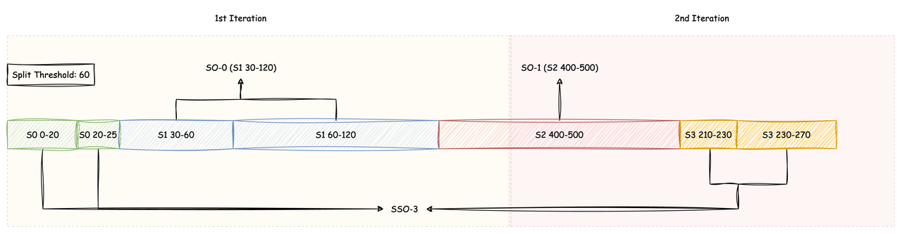 在第一轮迭代中,S0 的两个数据段将作为 SSO-3 的第一个 Part 被上传,S1 的前两个数据段(30-60、60-120)将被合并为一个对象(SO-0)被上传,而 S2 的数据段由于只能部分满足第一轮迭代的内存限制,将被截断成两个 SO,在第一轮迭代中将能够满足内存限制的前一部分(S2 400-435)上传。