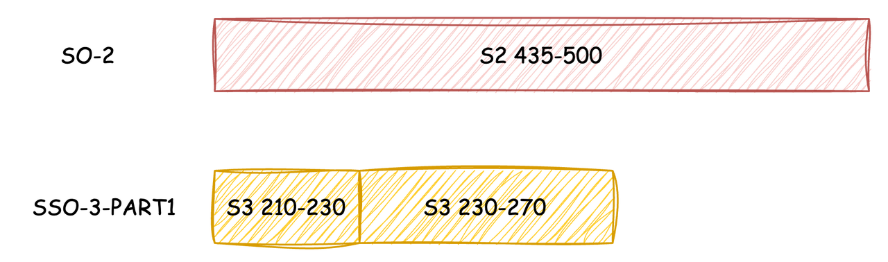 在第二轮迭代中,此前被截断的 S2 剩余数据段(435-500)会被单独上传为一个 SO,S2 的剩余数据段会作为 SSO-3 的第二个 Part 被上传。