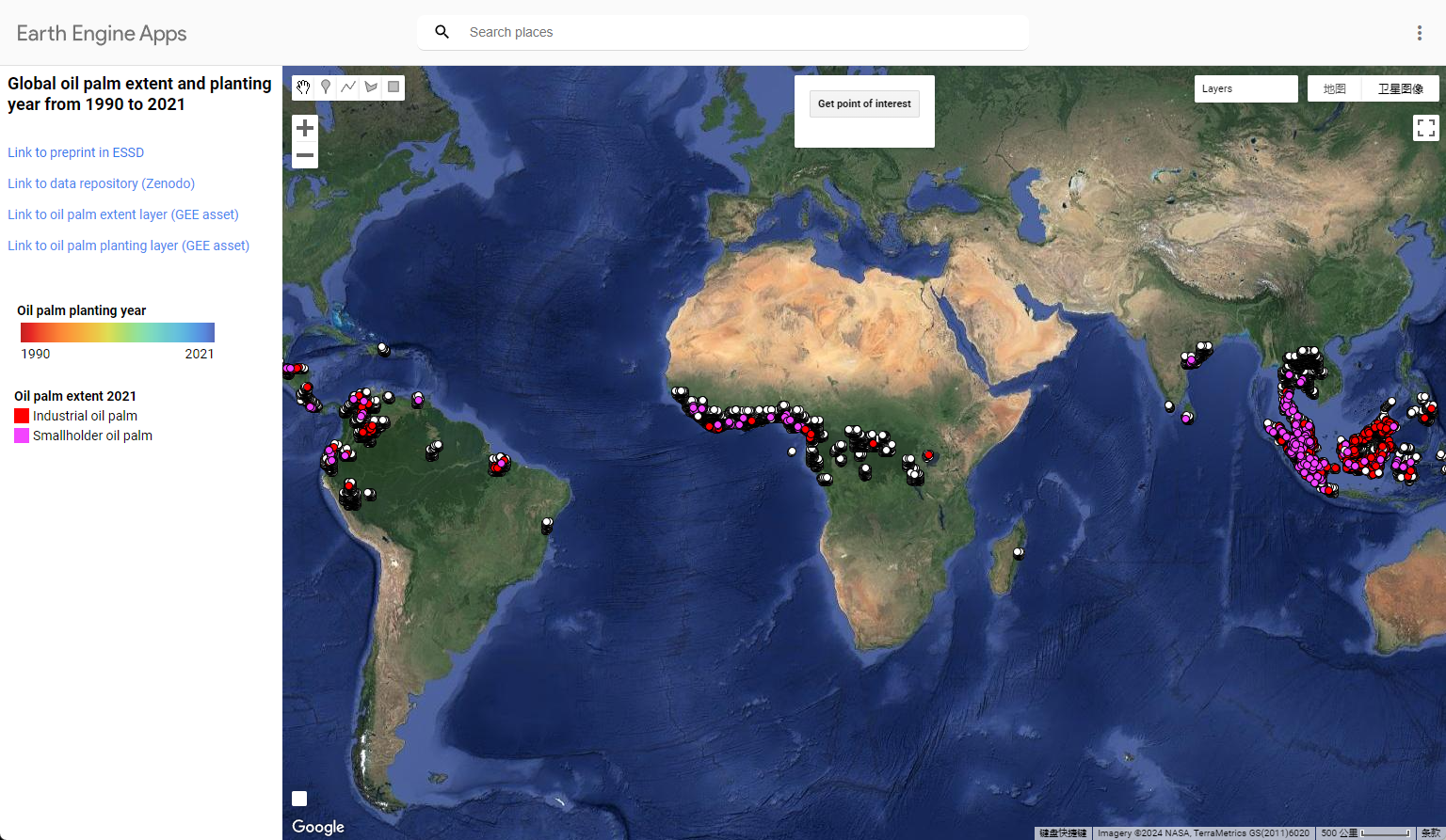 油棕范围和种植年份数据可通过以下网站的网络地图进行查询:。用户可通过该工具查看 Landsat 时间序列,并查看油棕种植园的历史卫星图像。