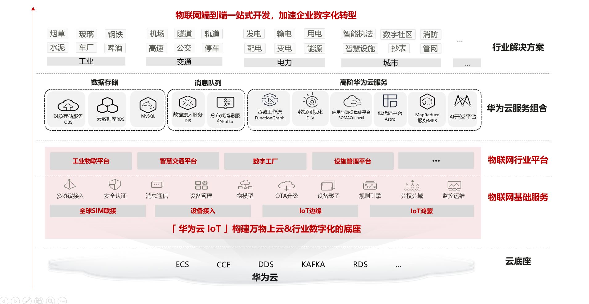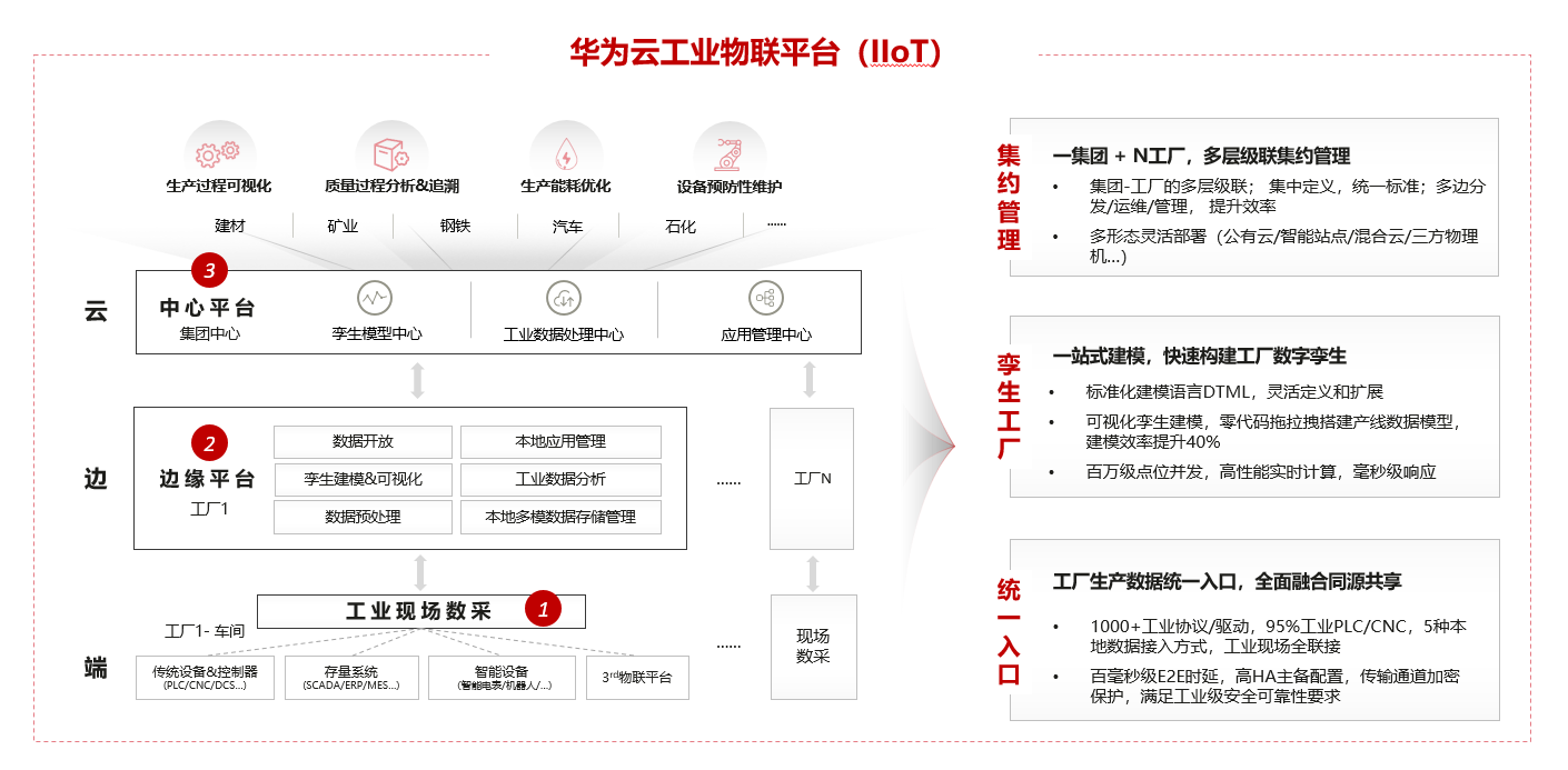为了让千行万业实现数字化、智能化,华为云IoT构建了一个高性能、高可靠物联网平台,包含设备接入、IoT边缘等基础云服务,以及工业物联平台、数字工厂、设施管理平台等行业平台。帮助广大的客户、伙伴、开发者,实现海量物联网设备的接入,同时还可以基于华为云强大的技术底座,组合华为云其他技术能力使用,在工业、交通、城市等行业中快速完成行业应用集成,构建场景化的物联网解决方案。