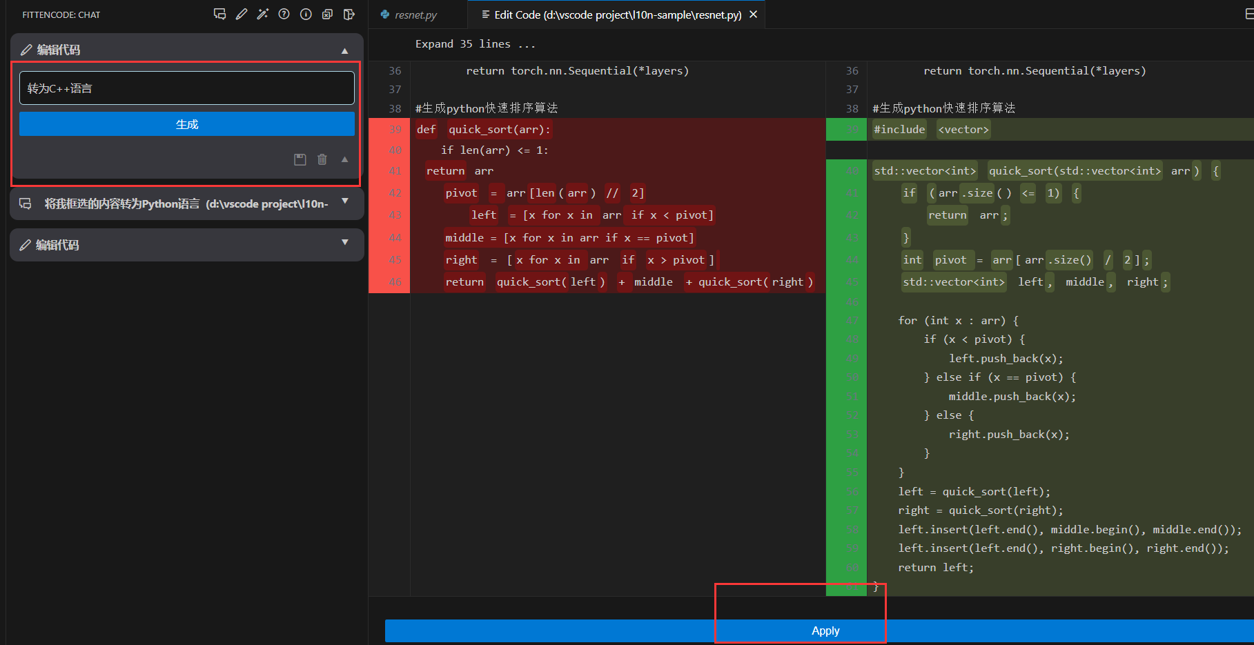 随后,用户可在输入框中输入指示,Fitten Code 会新建一个窗口对比显示更改前和更改后的内容,用户可通过点击 "Apply" 应用更改,如下图所示: