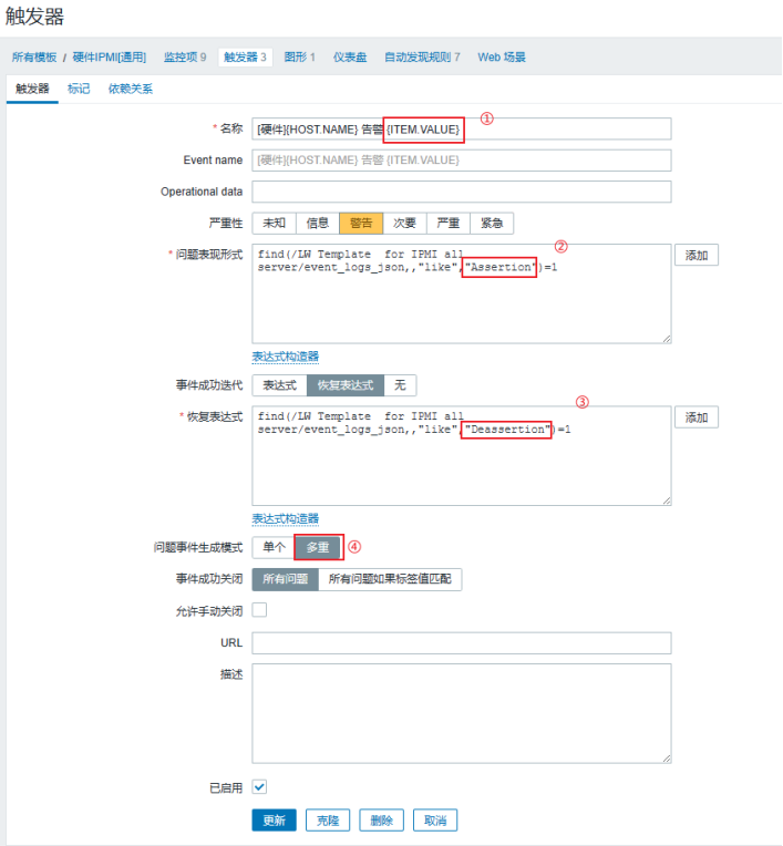 - 问题事件生成模式:多重:触发器未恢复的情况下可以多次产生告警;单个:多次规则匹配,如果已经产生的告警为恢复的情况下,不会重新产生新告警。效果如下