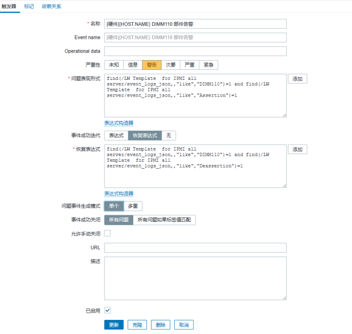 触发表达式:监控值包含DIMM110 且 包含关键字 "Assertion";