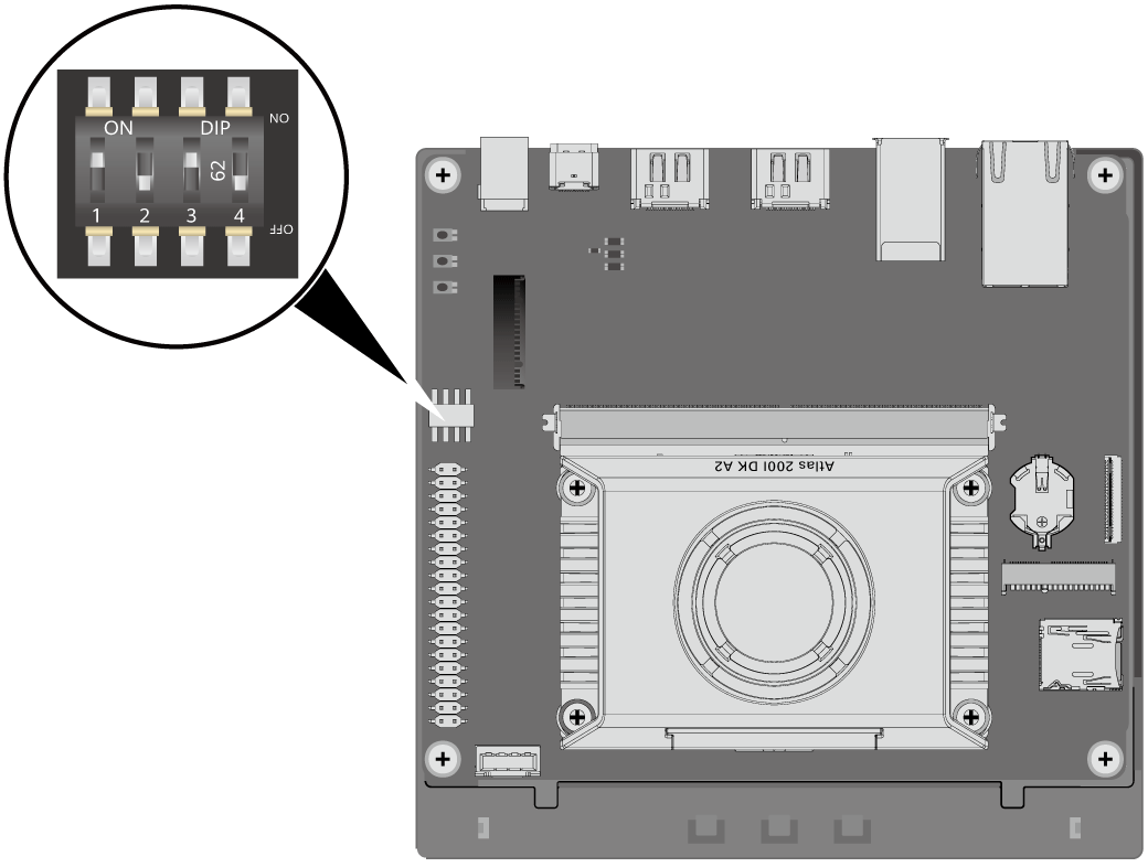 确保开发者套件的拨码开关2、3、4的开关值如图所示: