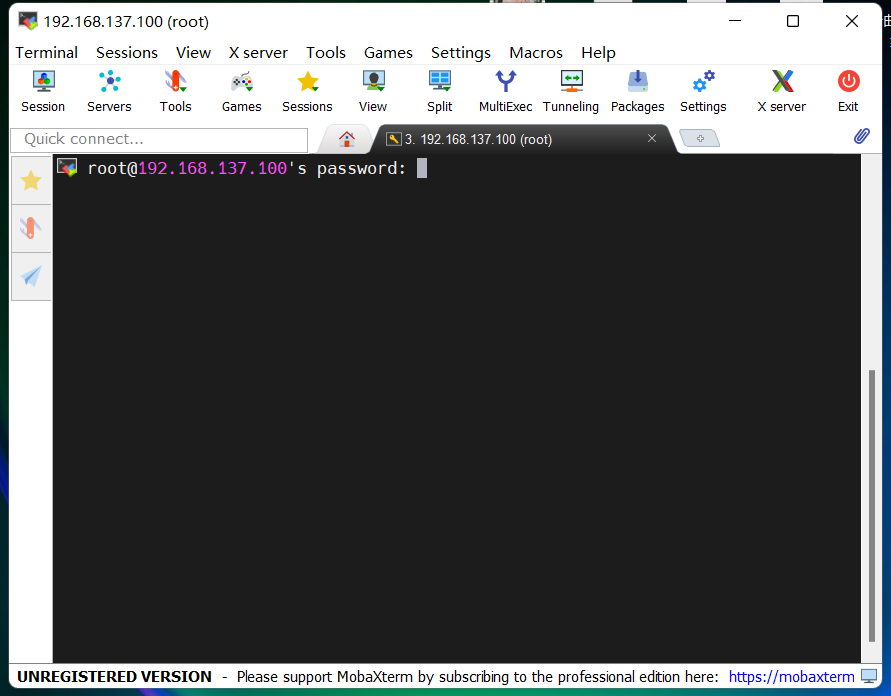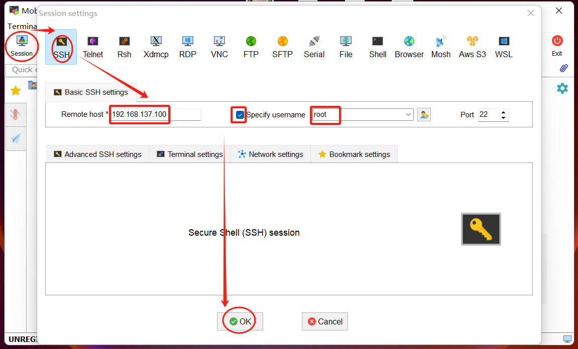 打开SSH远程登录工具“MobaXterm_Personal_22.2.exe” -> Session -> SSH