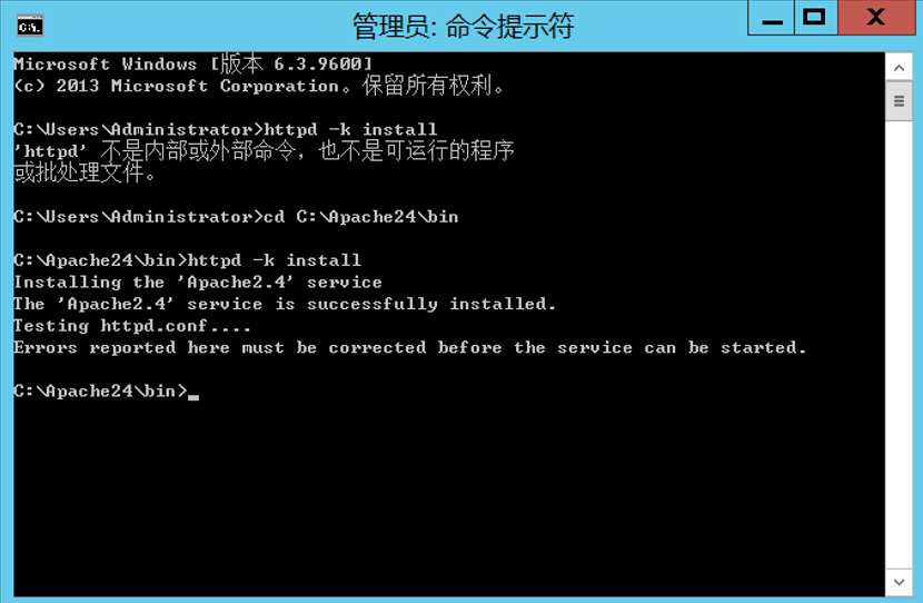 cmd管理员运行,cd到apache的bin文件下,输入httpd.exe回车