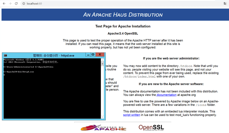 没有报错(看起来就像是卡在那里)说明服务启动成功,不要急着关cmd,关掉Apache服务就停止运行了,我们先验证一下Apache服务是否成功启动