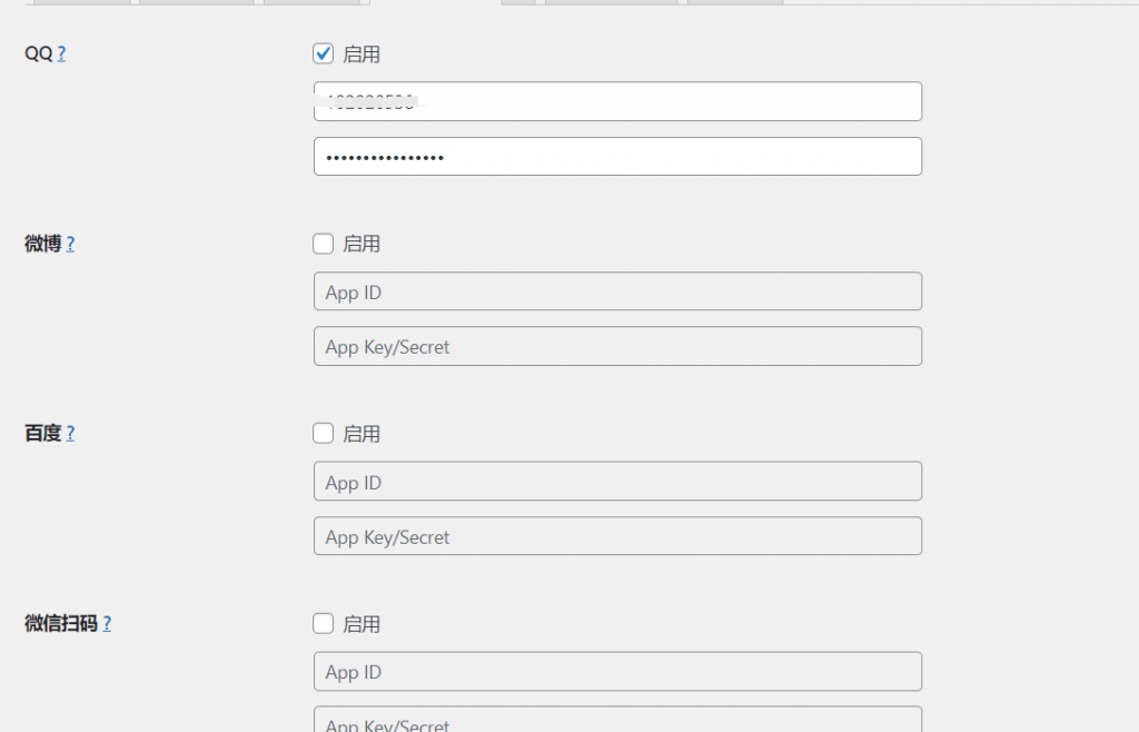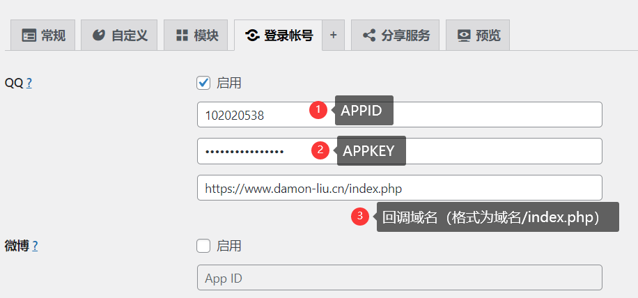 然后,在登陆账号里填写APPID、APPKEY和回调域名,注意回调域名要和QQ互联上保持一致,这里也应填写 域名/index.php。