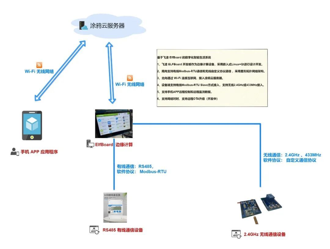 除了以上两种端侧设备之外,手机APP应用程序,也是属于端侧显示设备。手机APP应用是通过涂鸦云的间接转发方式,与ELF 1S开发板边缘中控进行端对端通信的,开发板边缘中控可以转发手机APP的控制指令到无线网络模块,以及接收边缘中控上报的环境监测数据。