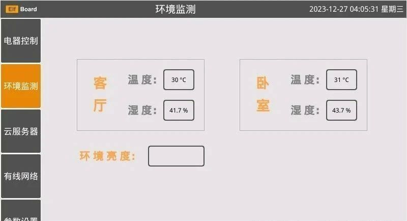 界面2是一个环境监测界面,在这个界面,可以把开发板上面的温湿度传感器数据(客厅是实际值,卧室是模拟值)和环境亮度数据在界面上面实时显示出来,这个界面还可以扩展到土壤数据监测,空气颗粒物监测,环境噪声监测,等等。