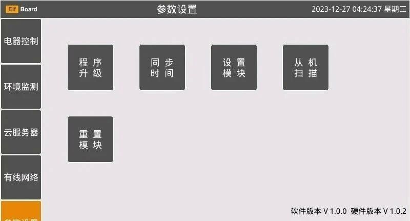 界面5是ELF 1S开发板边缘中控的参数设置界面,在这个界面里面,可以对开发板边缘中控本身进行程序升级(未完成),同步网络时间,设置USB无线模块,端侧从机扫描,以及重置USB无线模块,开发者还可以在这个界面扩展更多有趣好玩的参数配置功能。