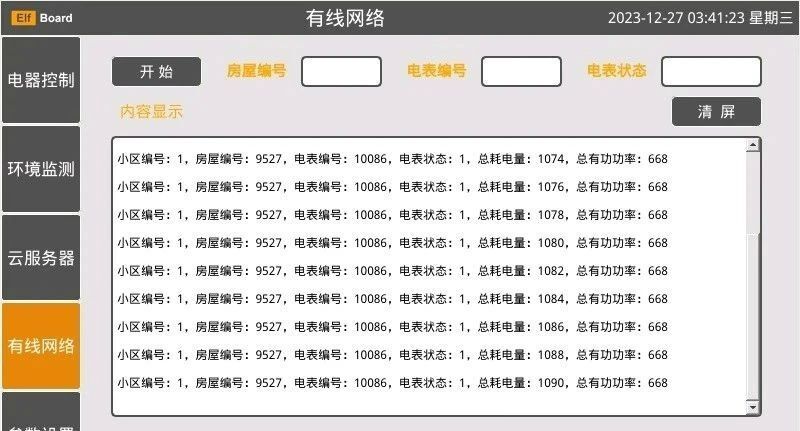 界面4是一个有线网络界面,这个界面实现了一个远程抄写电表数据的功能,通过RS485总线和Modbus-RTU软件协议,让ELF 1S开发板边缘中控连接一个虚拟电表,虚拟电表的用电数据不断更新(模拟用电过程),然后实现电表数据的实时读取,并在信息窗口进行显示。
