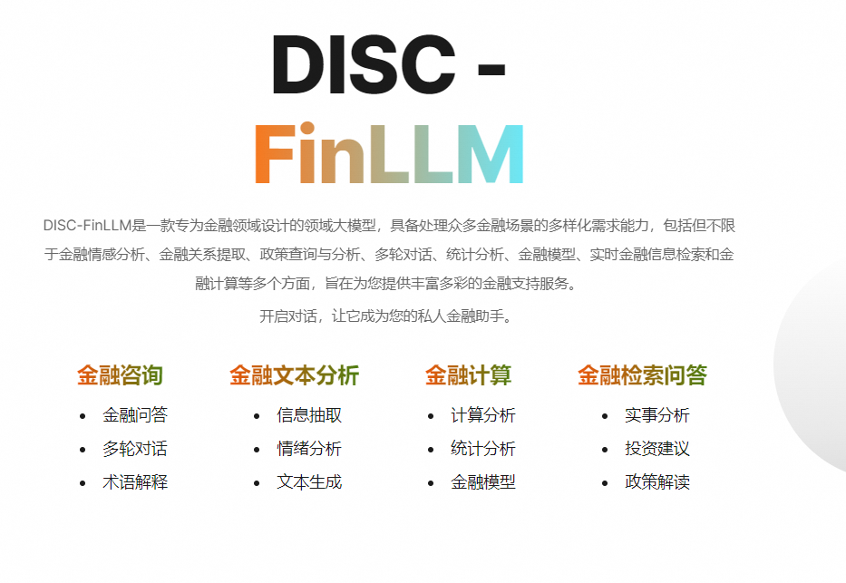 DISC-FinLLM 是一个专门针对金融场景下为用户提供专业、智能、全面的金融咨询服务的金融领域大模型,