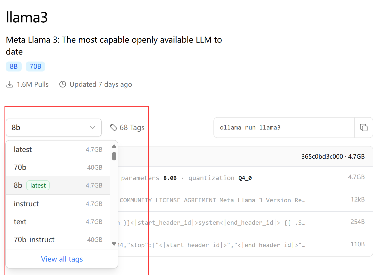 我们点开左边的方框,下拉能够看到很多的大模型,在这里b是指billion,中文意思是十亿,用来表示模型参数的数量级。在人工智能领域,模型的大小通常以其参数的数量来衡量,而参数的数量可以非常庞大。当然,参数数量越大对硬盘和性能的需求就越大。比如我的3060显卡跑8B的llama3就一般能占用到80%。所以若想本地使用大模型,性能的需求还是很重要的。