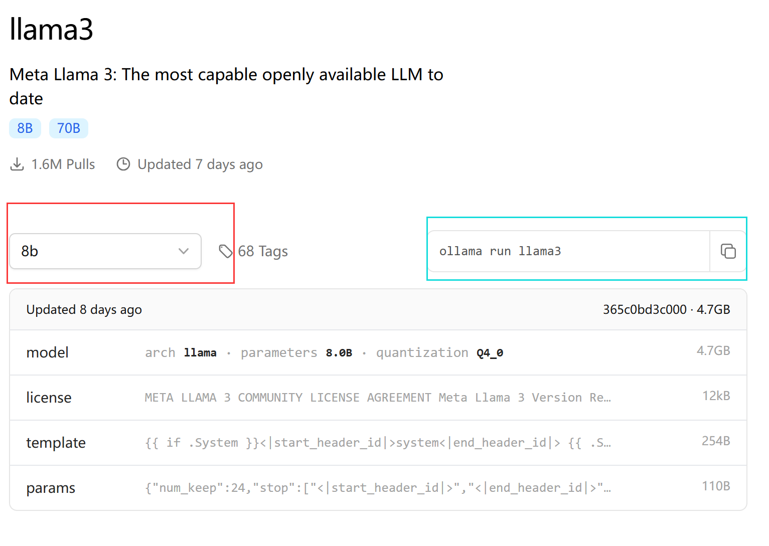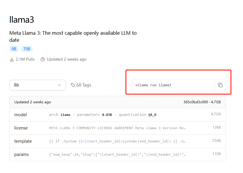 可以看到两个选择框,左边的能够选择大模型的规格,右边则是安装的指令。