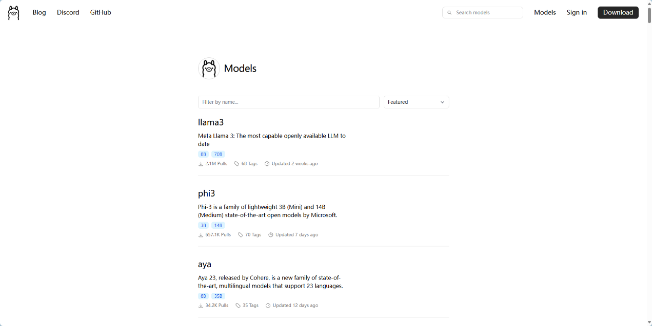 随后你就可以看到很多的开源大模型。Ollama为你提供了丰富的开源大模型资源,有的大模型甚至开源了不过几个小时,你就可以在Ollama上找到。