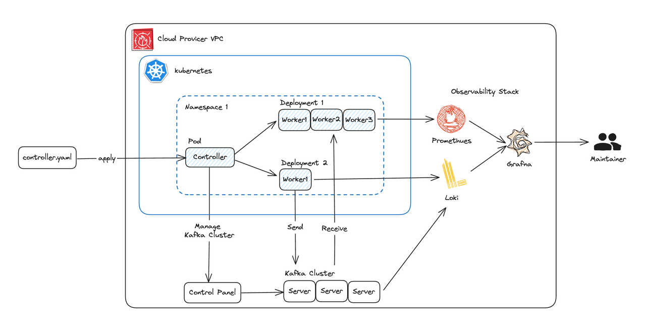 Worker:运行 Kafka 客户端产生任务所需的负载,同时负责可观测数据的上报和客户端侧的 SLA 检查