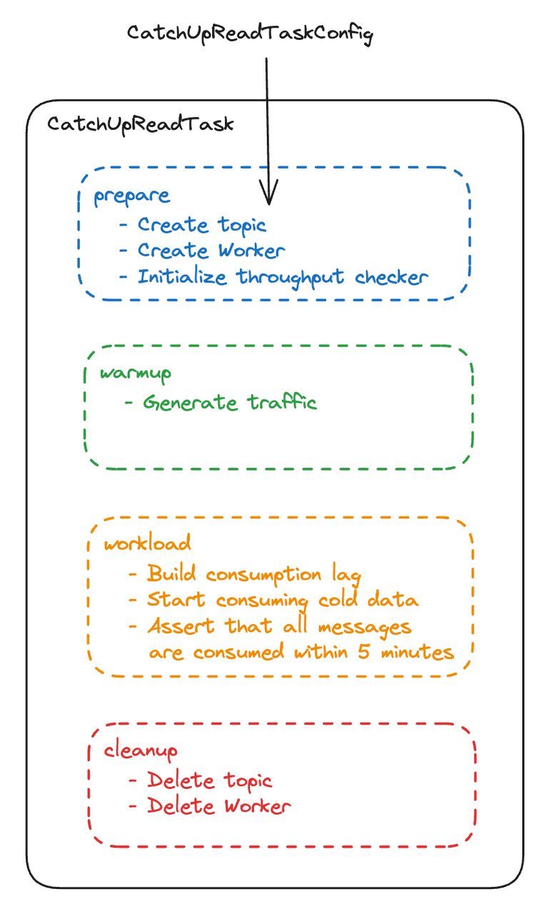 测试用例的配置通过泛型指定,以 CatchUpReadTask 为例,这个类的定义是_public class_ CatchUpReadTask extends AbstractTask <CatchUpReadTaskConfig>对应的配置类 CatchUpReadTaskConfig 中定义了运行这个任务所需的参数,可以由用户动态指定每个任务场景都是通过实现以下生命周期方法描述一个特定的流量模型: