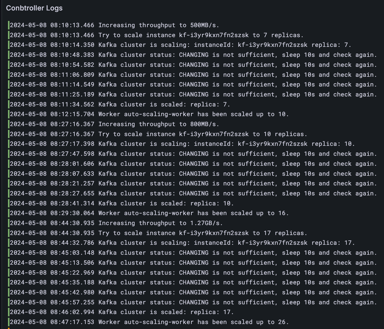Marathon 框架提供了一系列工具类来简化任务的编写,包括创建 Kafka topic,查询消费堆积,修改 Worker 流量,等待某个指定事件,对 Kafka 集群注入故障等等。通过这些工具以及 Worker 可以模拟任意规格的流量,以及多种特殊场景,比如我们的任务集中有对大规模冷读的测试;强制关闭某个 Kafka 节点并验证数据完整性的测试等等通过代码编写任务可以非常灵活的构造想要的场景,唯一的限制是不得编写任何不可中断的阻塞操作。Controller 在必要时(如运行 Worker 的 Spot 实例被回收)会中断任务线程并回收资源,然后重试当前任务
