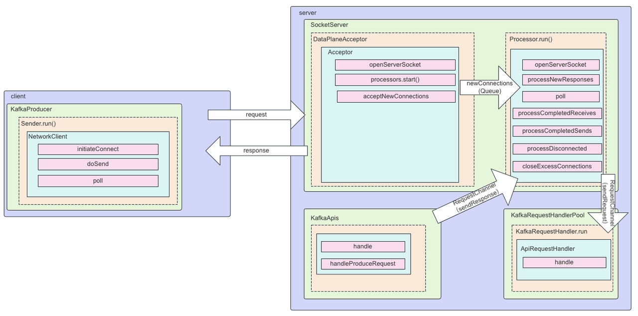 图上就是一个从发送消息到收到响应主要经过的流程。Client:1.KafkaProducer 初始化 Sender 线程2.Sender 线程从 RecordAccumulator 中获取攒批好的数据(这里详细的客户端发送可以看 https://mp.weixin.qq.com/s/J2_O1l81duknfdFvHuBWxw)3.Sender 线程调用 NetworkClient 检查连接(未 ready 需要 initiateConnect)4.Sender 线程调用 NetworkClient 的 doSend 方法将数据写入 KafkaChannel5.Sender 线程调用 NetworkClient 的 poll 进行实际的发送Server:1.KafkaServer 初始化 SocketServer、dataPlaneRequestProcessor(KafkaApis)、dataPlaneRequestHandlerPool2.SocketServer 初始化 RequestChannel、dataPlaneAcceptor3.dataPlaneAcceptor 负责获取连接并分配处理任务给对应的 Processor4.Processor 线程从 newConnections 的 queue 中取出任务进行处理5.Processor 线程处理准备好的 IO 事件