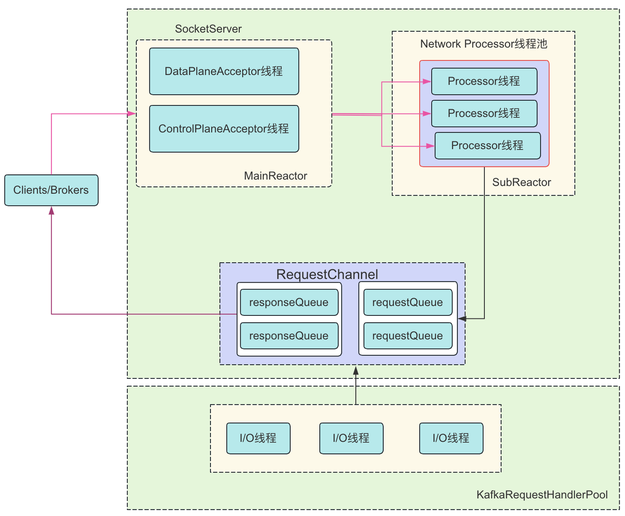 DataPlanAcceptor 和 ControlPlanAcceptor 都是 Acceptor 的一个子类,Acceptor 又是一个实现了 Runnable 接口的线程类,Acceptor 的主要目的是监听并且接收 Client 和 Broker 之间的请求,同时建立传输通道(SocketChannel),通过轮询的方式交给一个 Processor 处理。这里还有一个 RequestChannel(ArrayBlockingQueue),用于建立 Processor 和 Handler 的连接,MainReactor(Acceptor)只负责监听 OP_ACCEPT 事件, 监听到之后把 SocketChannel 传递给 SubReactor(Processor), 每个 Processor 都有自己的 Selector,SubReactor 会监听并处理其他的事件,并最终把具体的请求传递给 KafkaRequestHandlerPool。