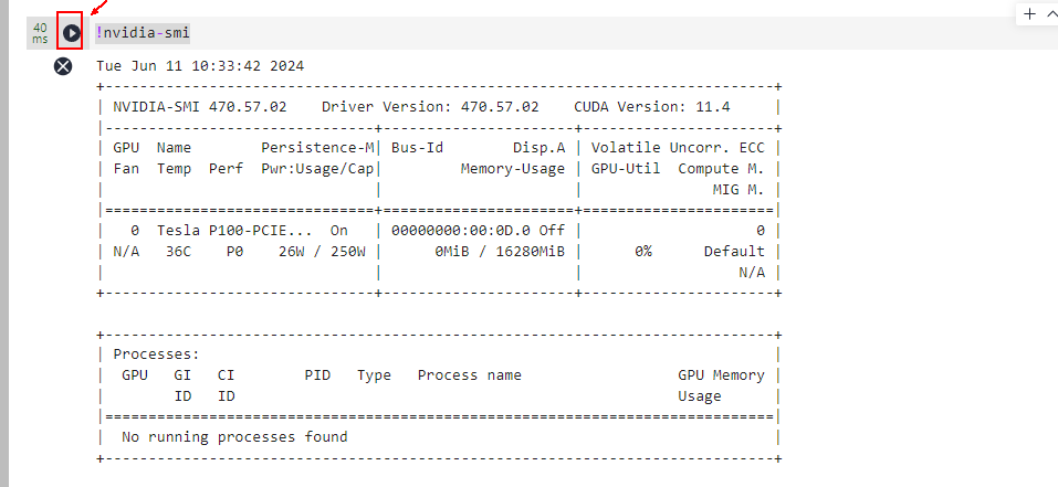 本案例可以使用 GPU,也可以使用 CPU 来运行,GPU 生成单张图片约 20 秒,CPU 需 6 分钟。您可以使用命令来查询当前机器的 GPU 是否可用,如果运行结果是一个表格,则表示 GPU 可用,实现命令如下: