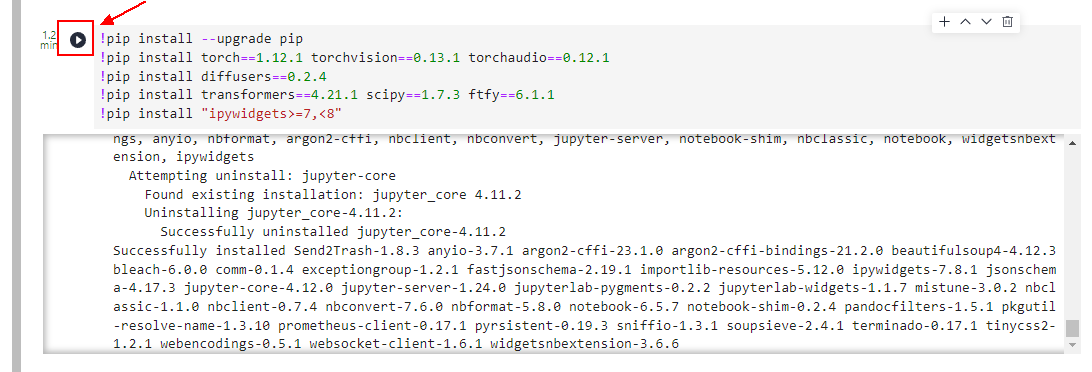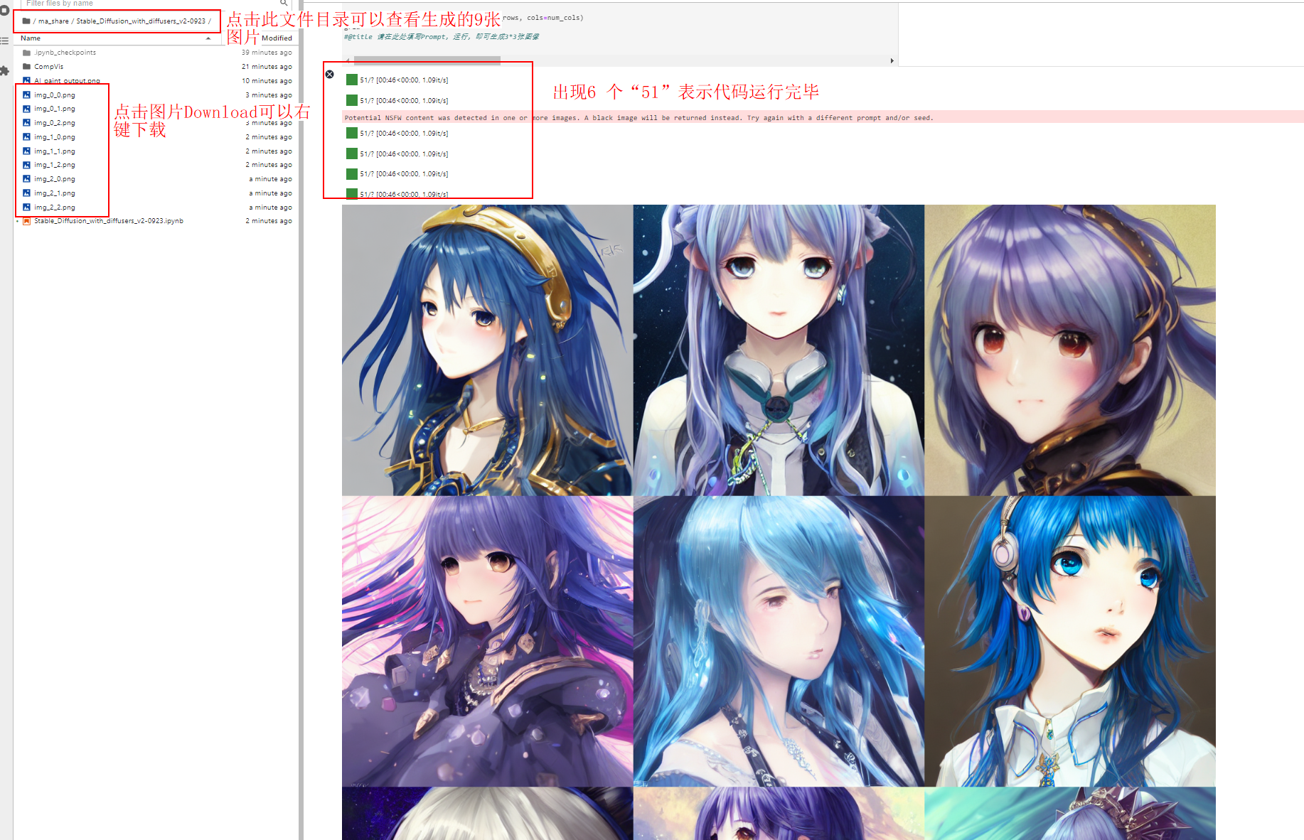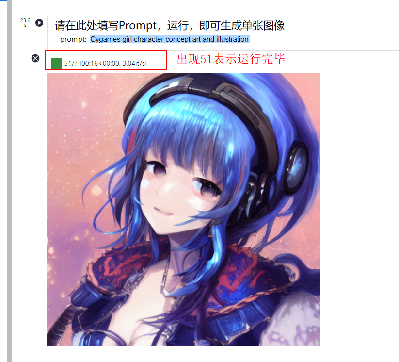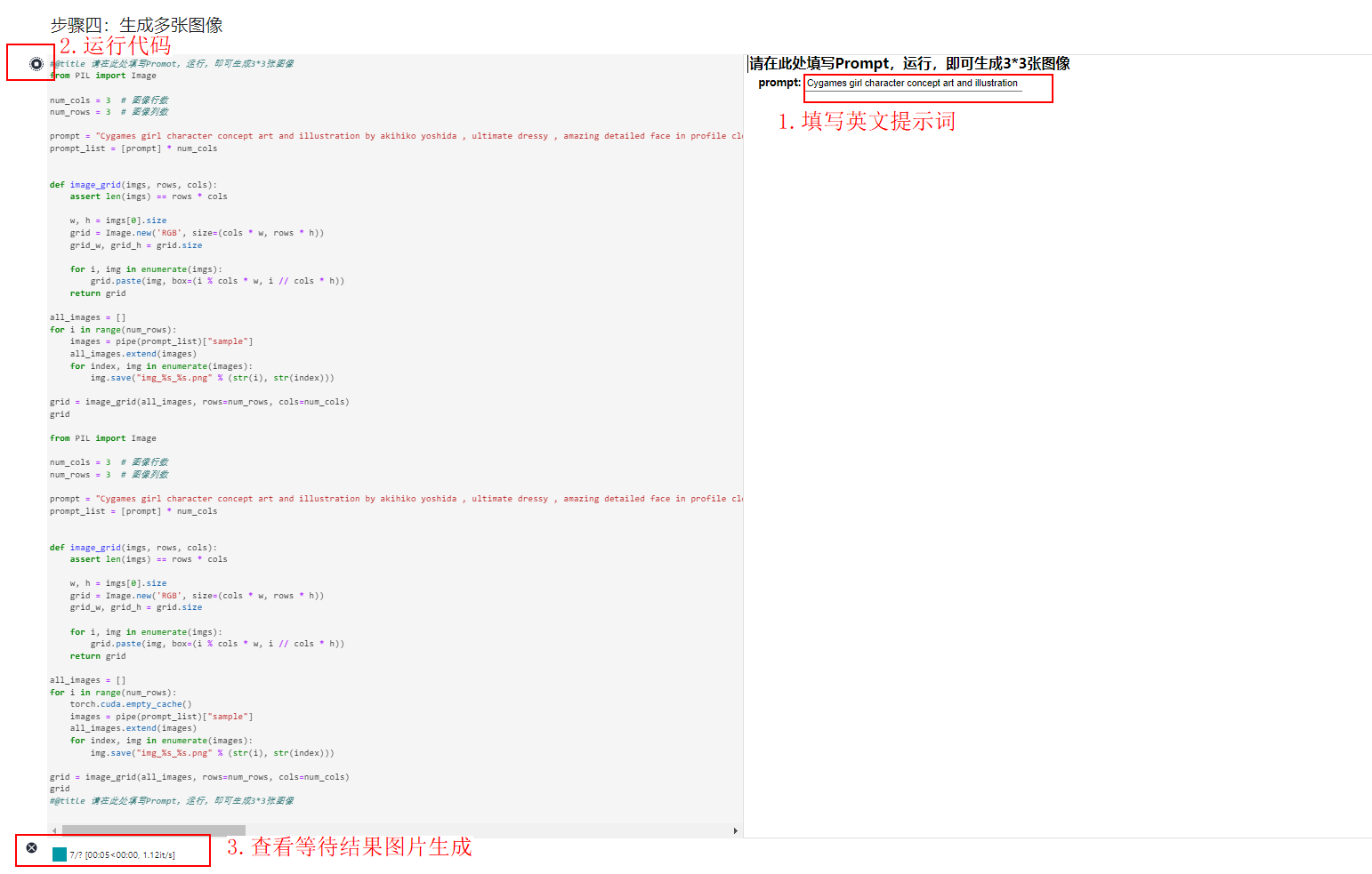 填写替换自己的英文提示词,然后点击代码运行: