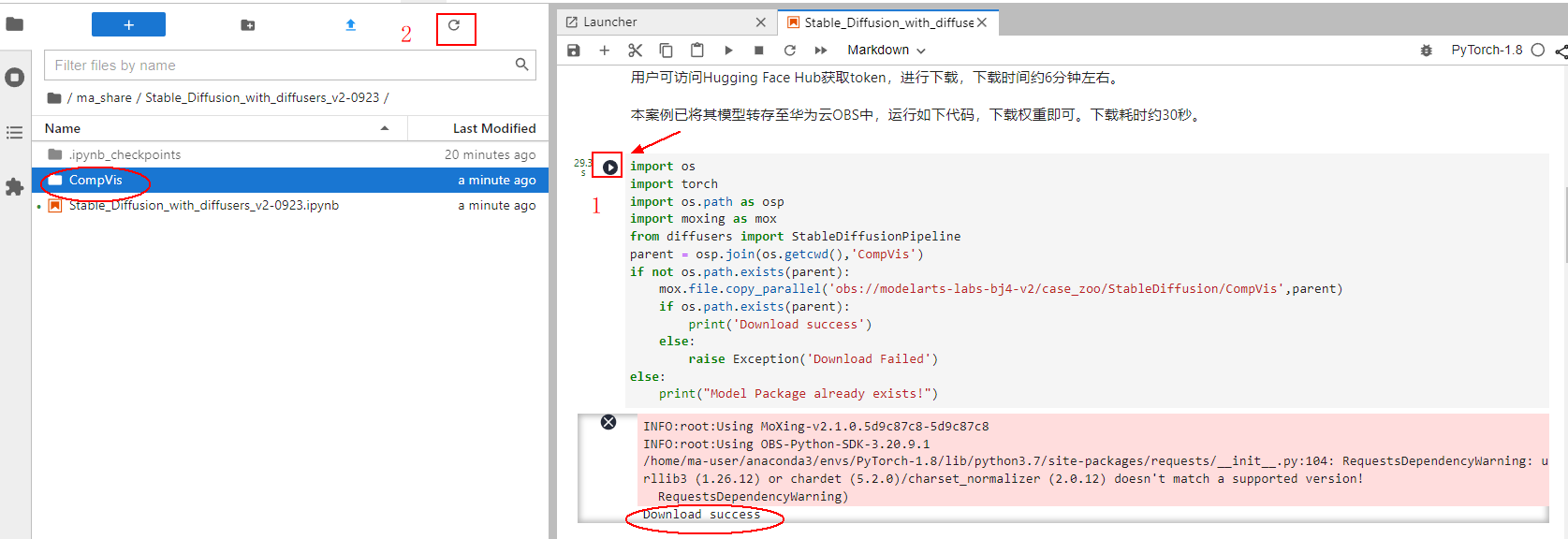 运行完可以看到出现“Download success”,刷新右边可以看到“CompVis”文件夹。