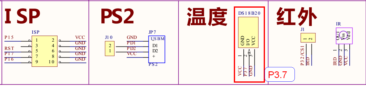 实验板上的DS18B20模块接在单片机的P3.7 IO口上,在插入DS18B20芯片时,圆弧朝上插入,具体效果可以看上面图片。
