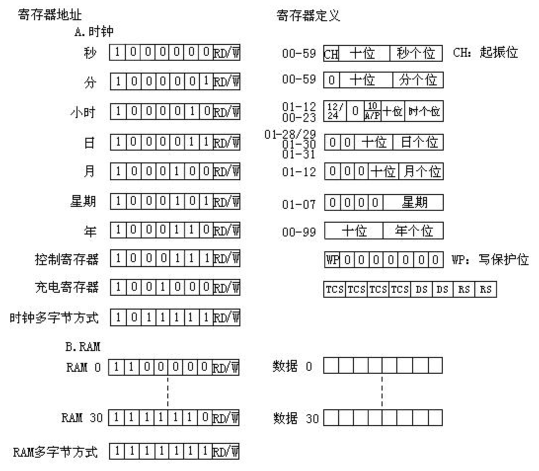 秒寄存器的位7定义为时钟暂停位。当此位设置为逻辑1时, 时钟振荡器停止,DS1302被置入低功率的备份方式, 其电源消耗小于 100 纳安(nanoamp)。 当把此位写成逻辑 0 时, 时钟将启动。