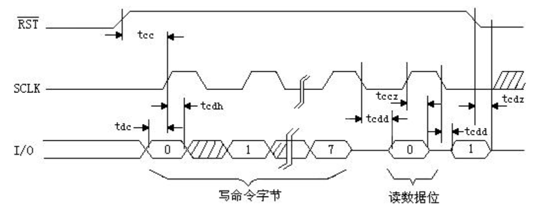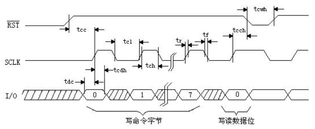 从时序图里得知,开始传输数据之前,RST保持低电平,时钟线保持低电平,开始传输数据时,RST保持高电平。数据是先从低位开始传输,在上升沿改变数据,在下降沿保持数据稳定,数据传输完毕之后RST保持低电平。