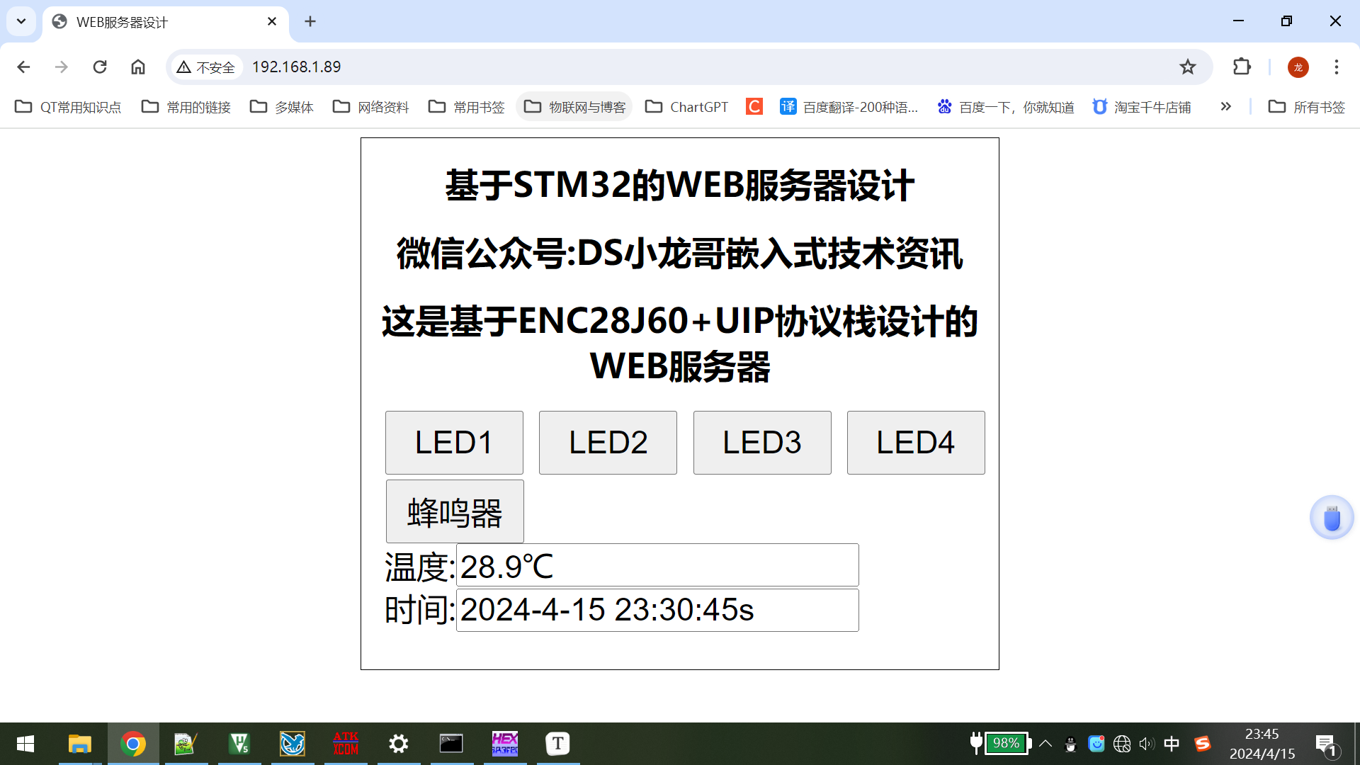 - LED灯控制:网页上设有控制按钮或界面元素,允许用户远程开关连接到STM32的LED灯模块,实现远程照明控制演示。