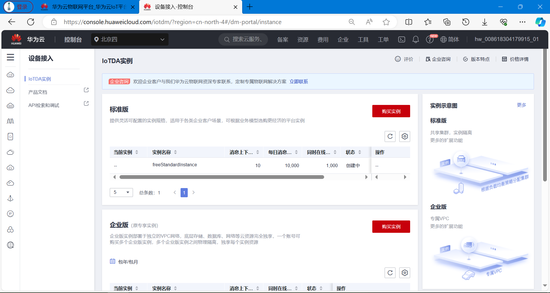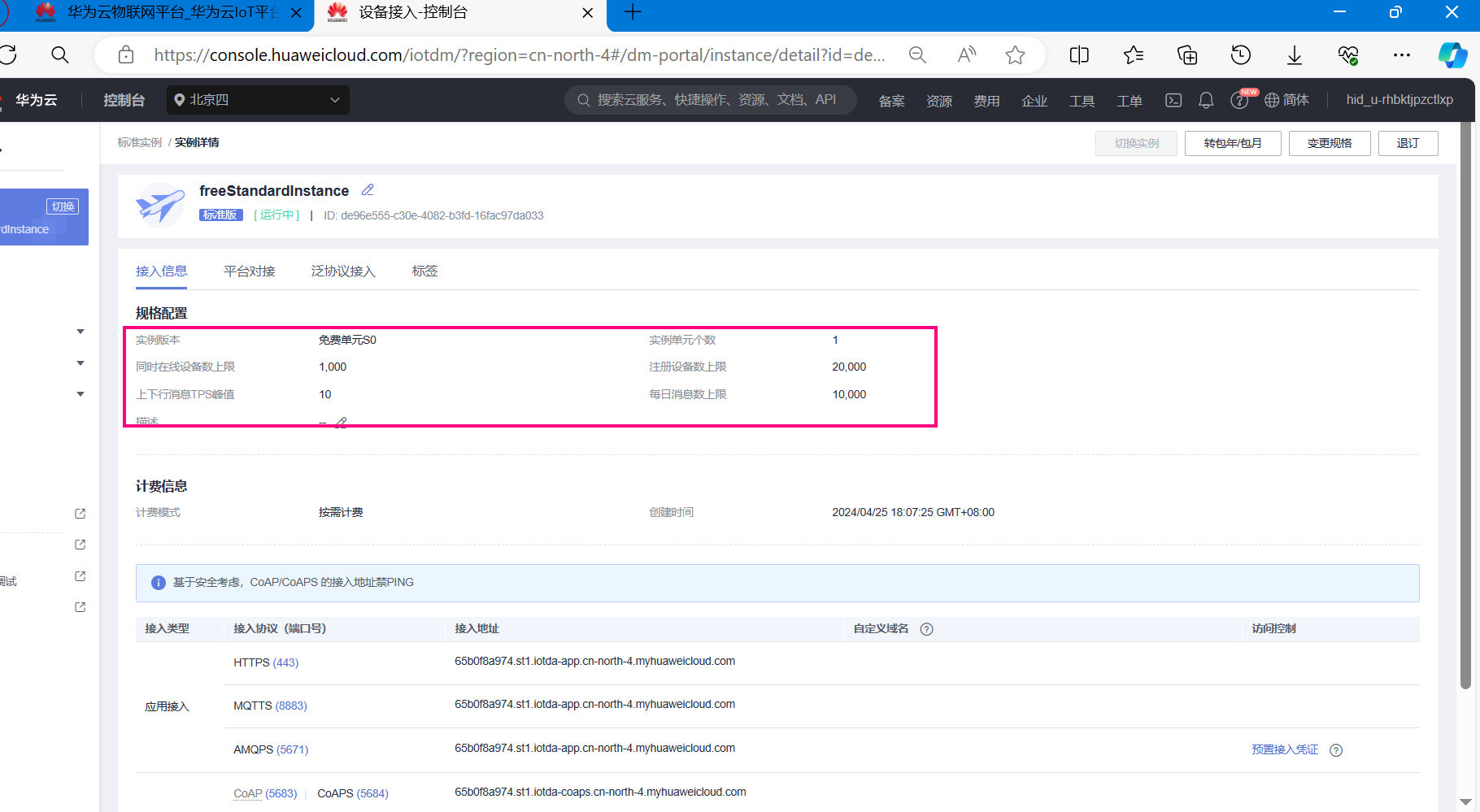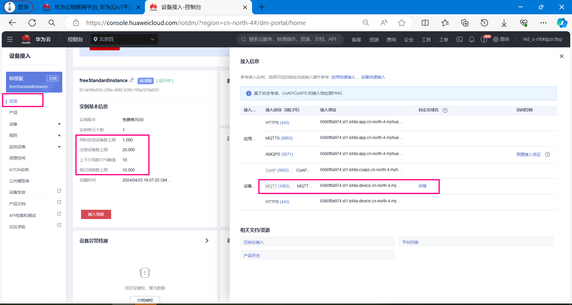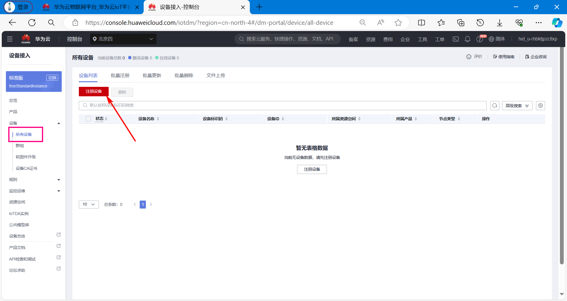 完成上面的操作之后,打开华为云网页后台,可以看到设备已经在线了。