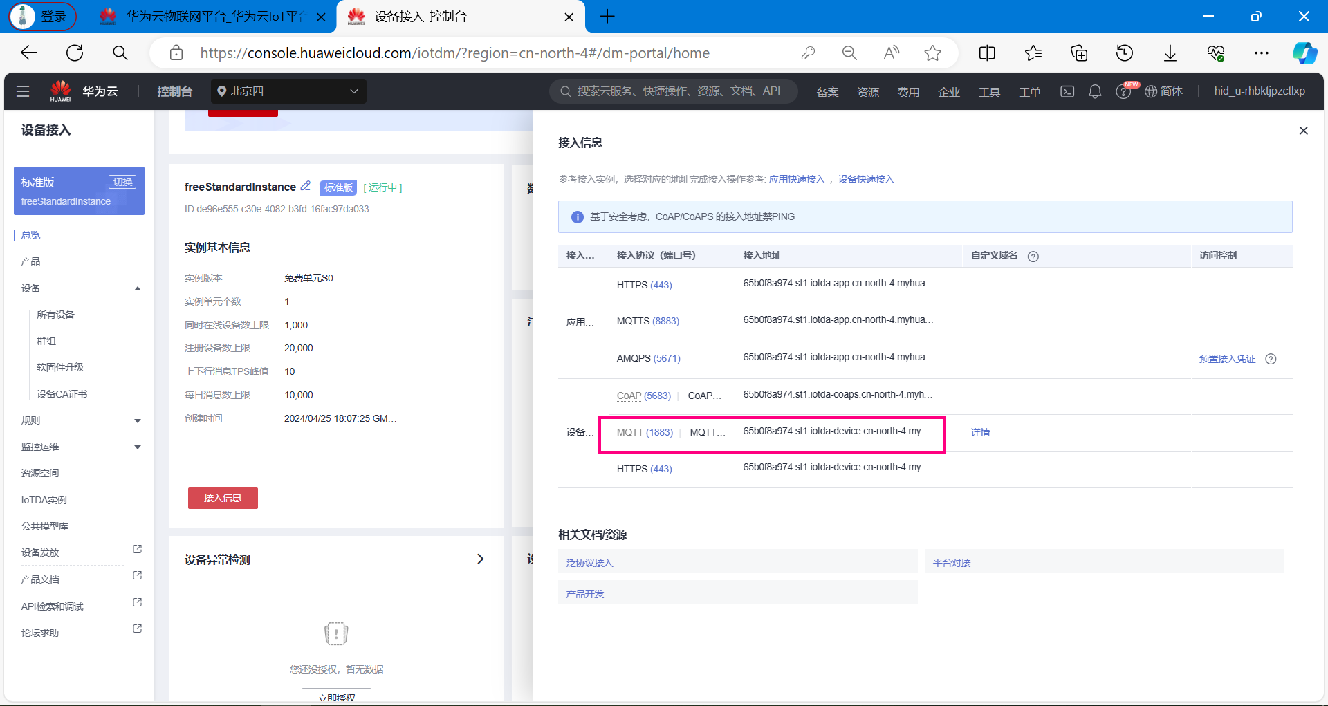 帮助文档地址:https://console.huaweicloud.cn/iotdm/?region=cn-north-4#/dm-portal/home