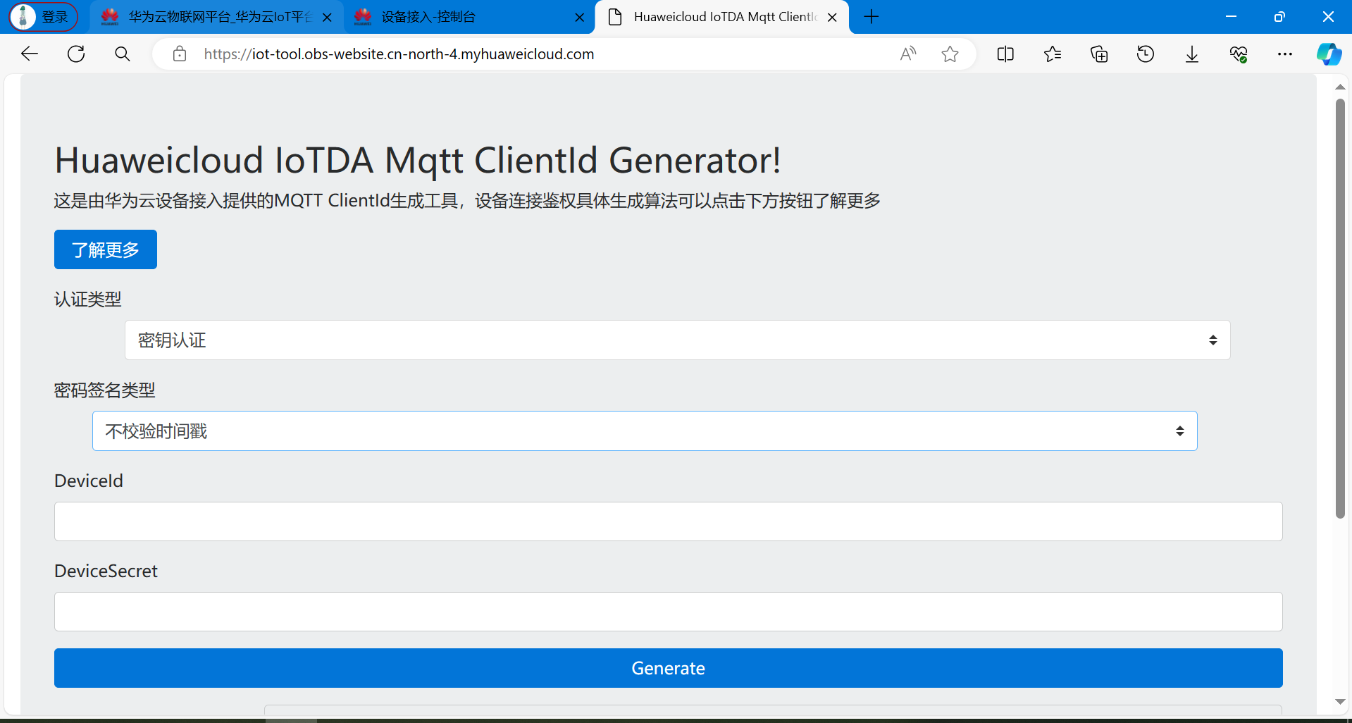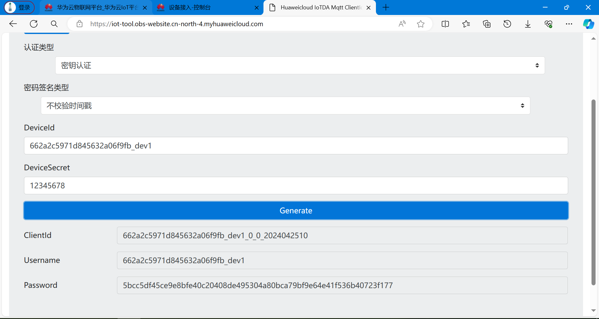 华为云提供了一个在线工具,用来生成MQTT鉴权三元组: https://iot-tool.obs-website.cn-north-4.myhuaweicloud.com/