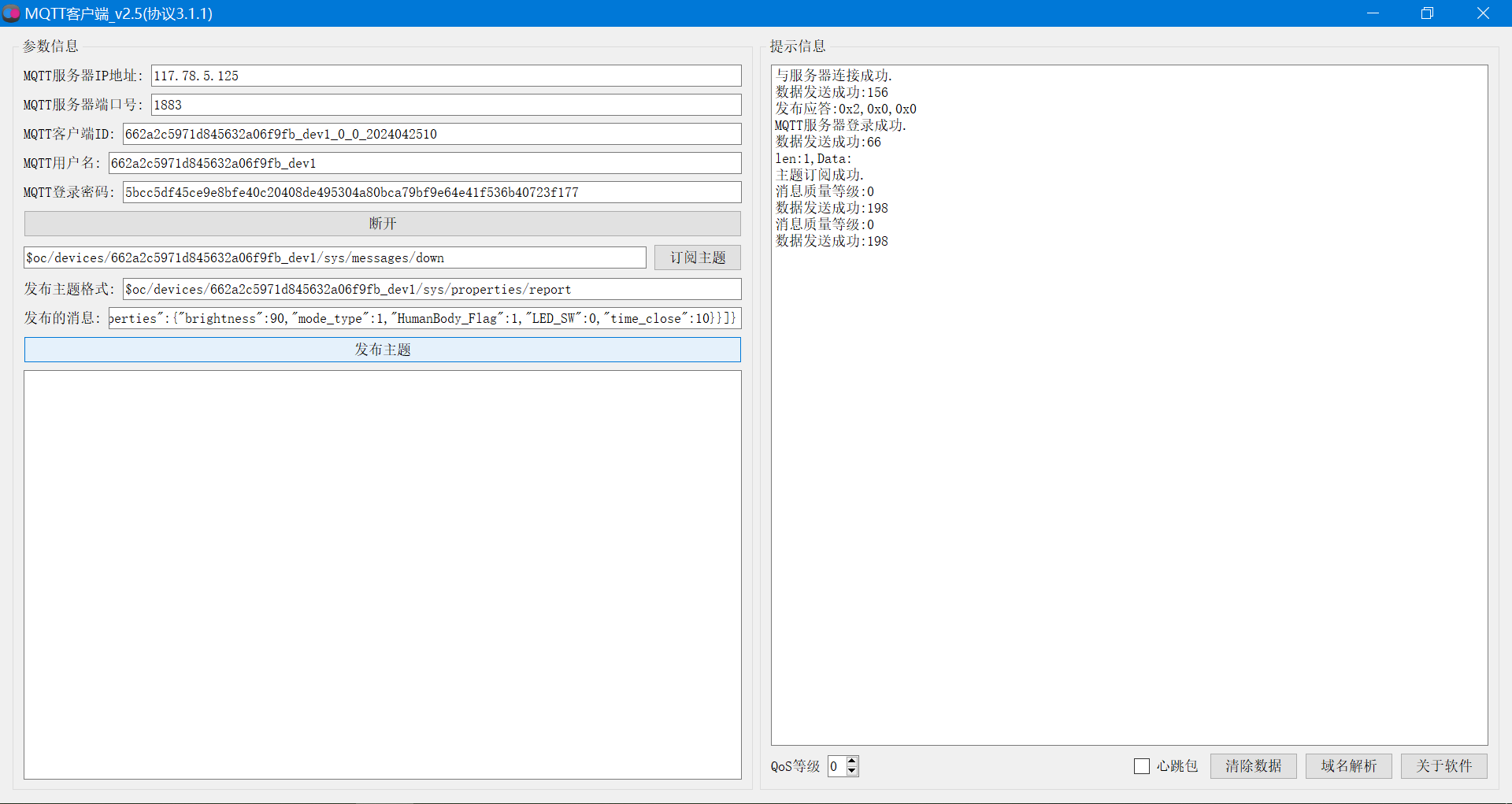 打开MQTT客户端软件,对号填入相关信息(就是上面的文本介绍)。然后,点击登录,订阅主题,发布主题。