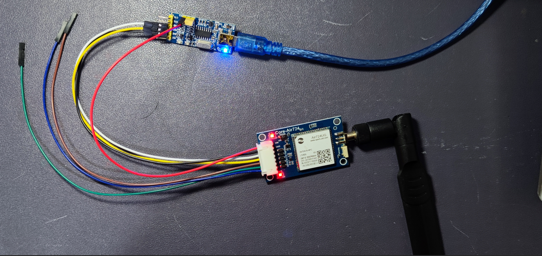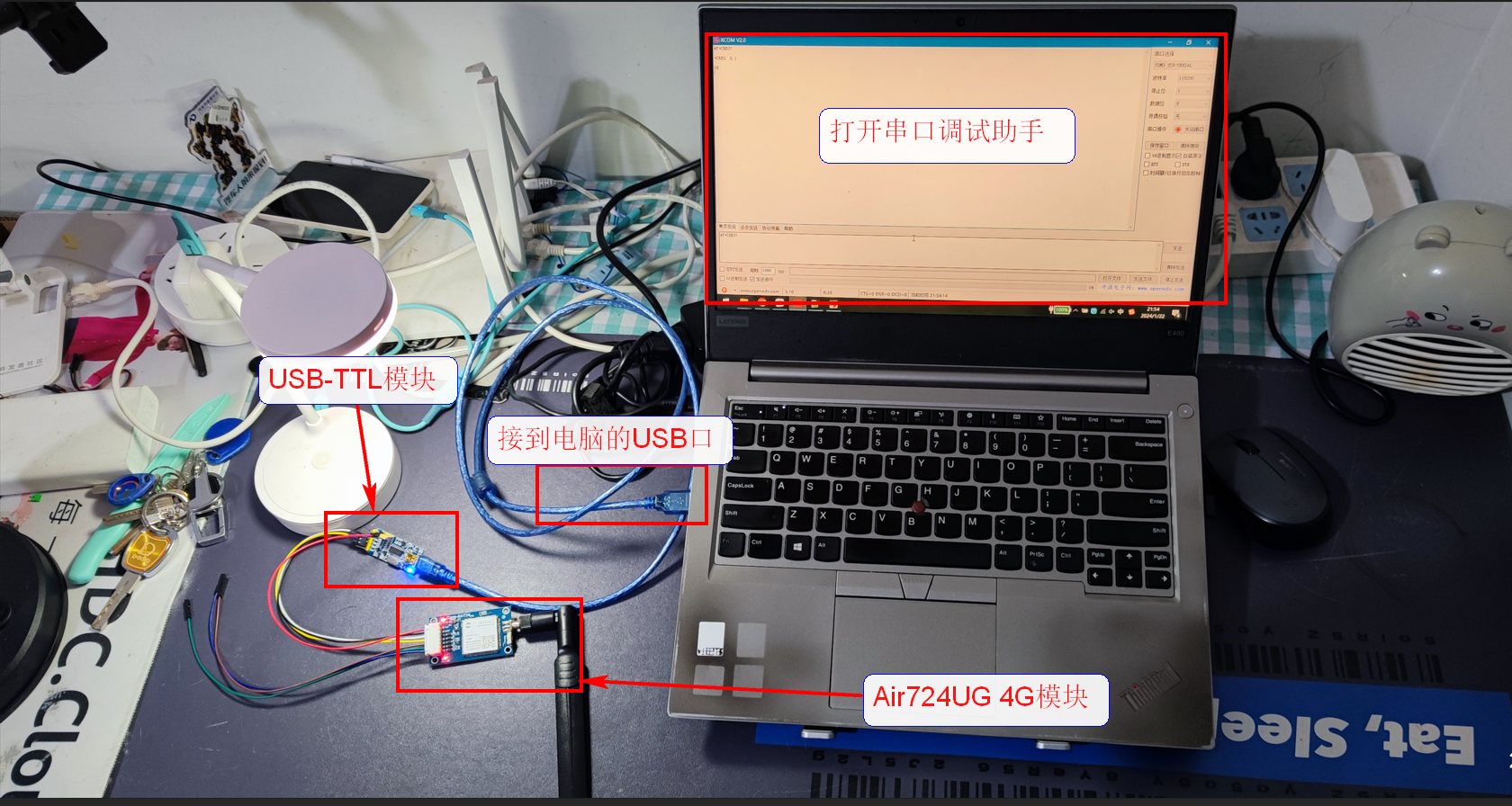 接下来直接将模块与USB-TTL模块连接,接入到电脑的USB,使用串口调试助手测试模块是否工作正常。