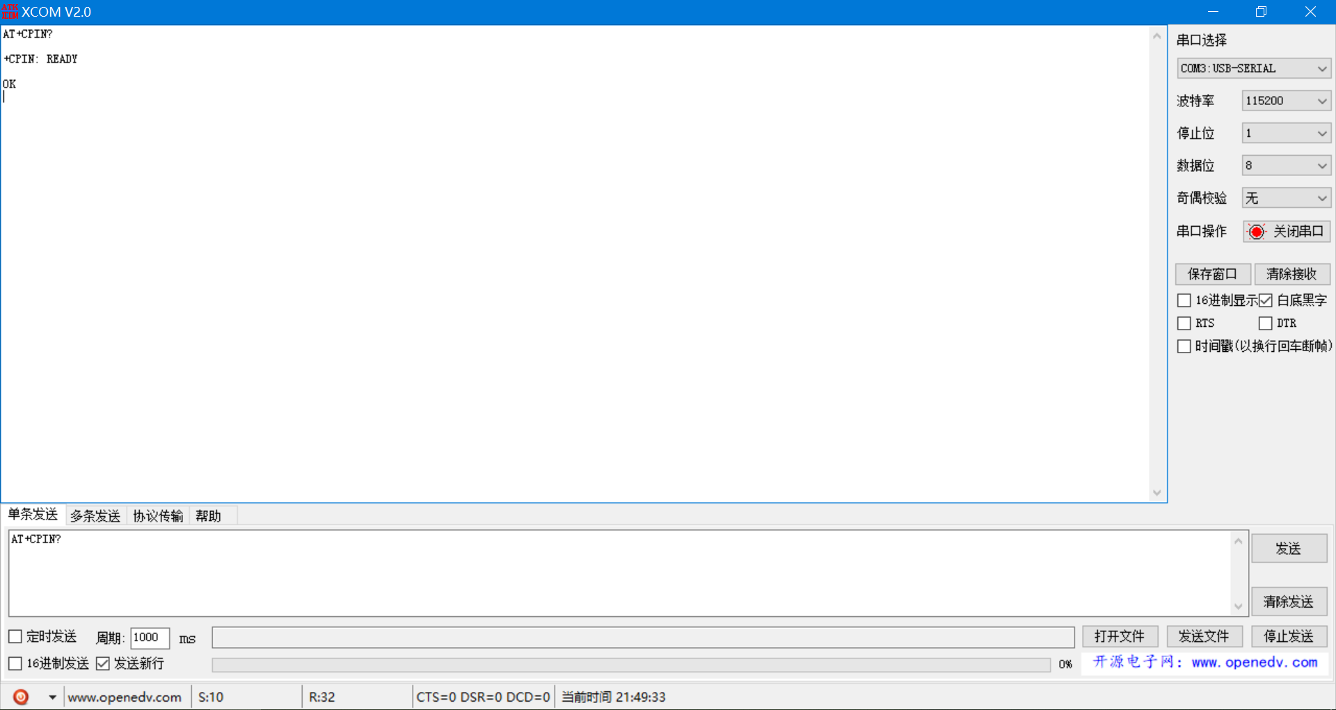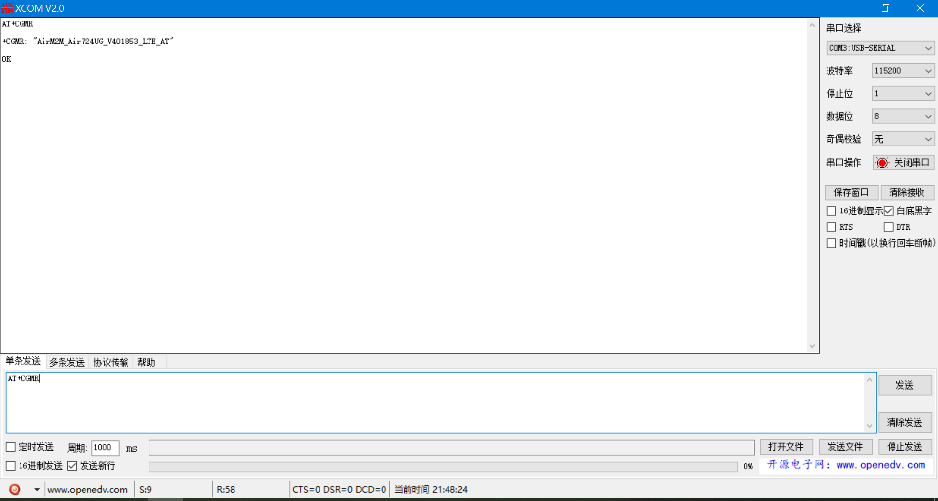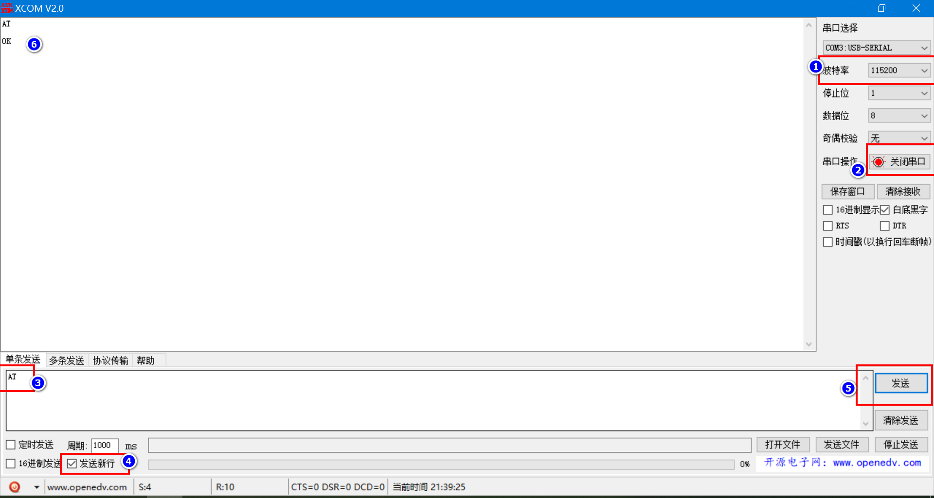 模块接好线,连接上电脑之后,发送AT命令测试模块是否正常(注意 勾选新行)。